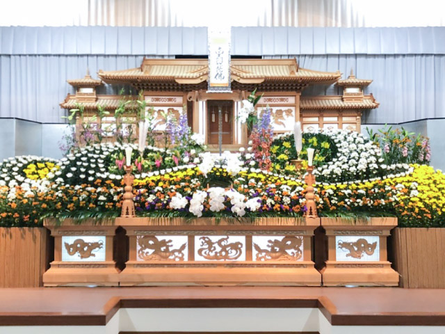 すみれホールのカトレアプランでは、「18尺祭壇・生花祭壇」を使用してお飾りいたします。